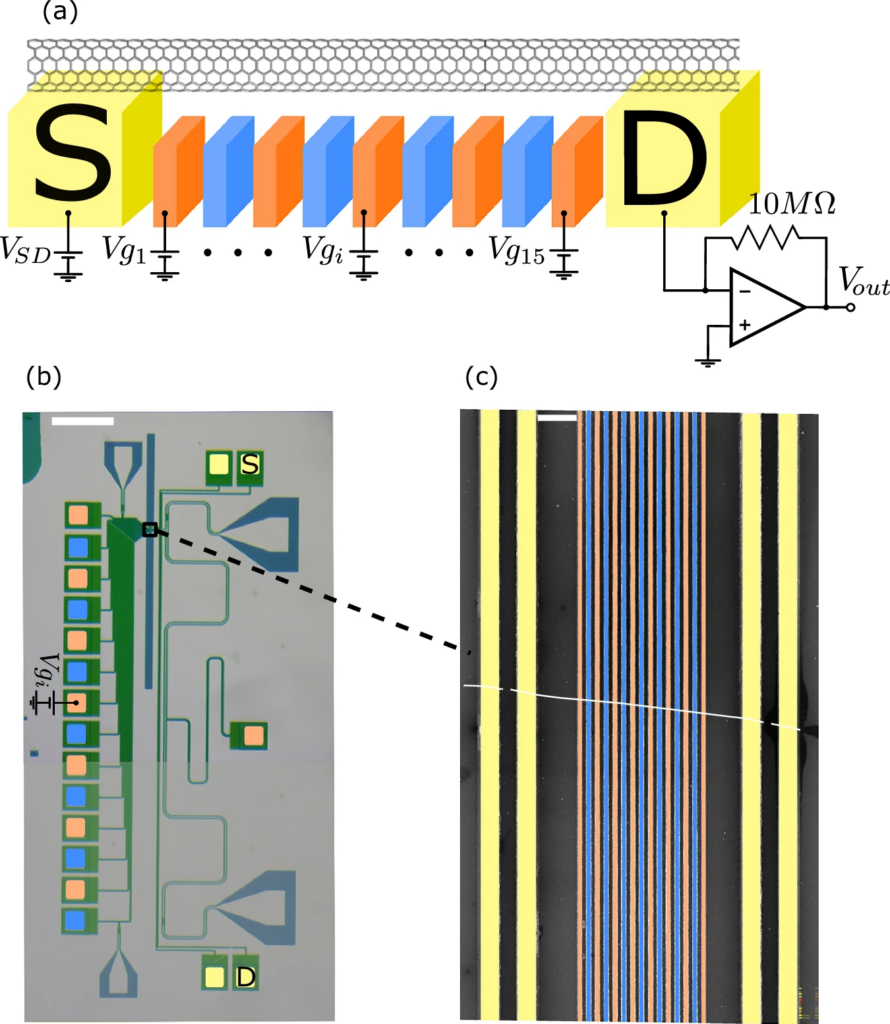 The experiment utilized a unique 15-gate “keyboard” architecture, where a 4-micrometer nanotube is suspended approximately 150 nm above a series of individually controlled palladium electrodes. By spatially modulating the local electrical potential—applying alternating voltages across the gates—the researchers induced a synthetic “charge density wave.” This mechanism mimics the Peierls transition found in complex condensed matter systems, effectively driving the nanotube from a metallic state to an insulating state. The study found that a minimum of seven modulated gates is required to develop a robust, clear energy gap, which remains stable against local perturbations.