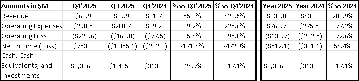 The Q4 GAAP Net Income of $753.7 million was primarily driven by a $949.6 million non-cash gain related to the change in fair value of warrant liabilities. On an adjusted basis, the company reported an Adjusted EPS of ($0.20) for the quarter.