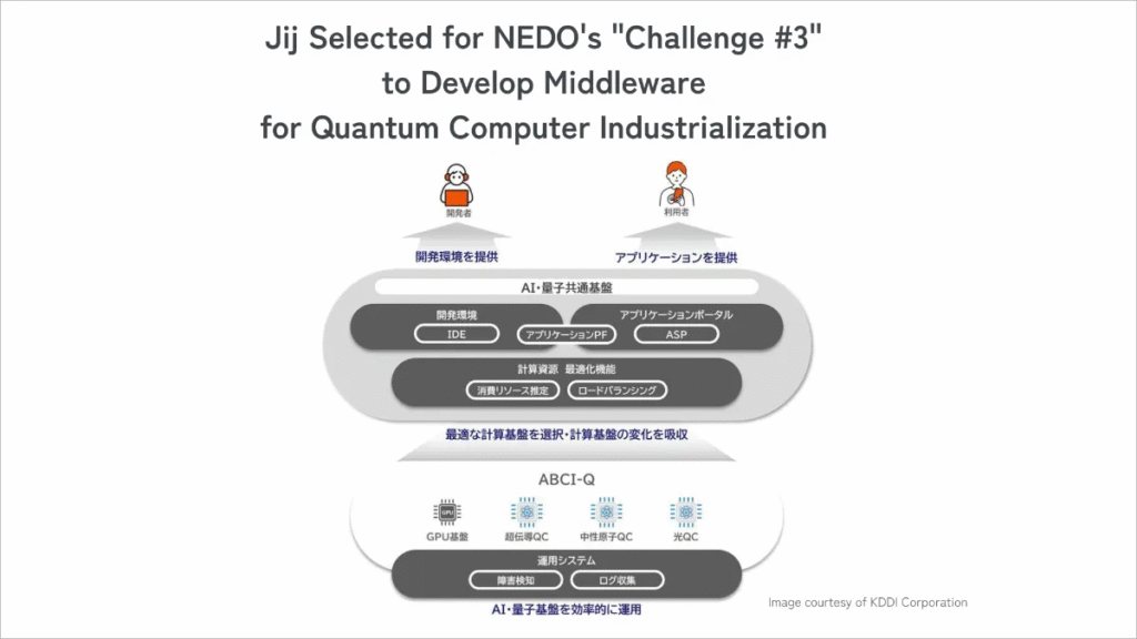 The joint research includes KDDI Research, Inc., Jij Inc., QunaSys Inc., the National Institute of Advanced Industrial Science and Technology (AIST), Waseda University, Keio University, Osaka University, and Shibaura Institute of Technology. The initiative will utilize the quantum-classical hybrid computing testbed (ABCI-Q) established at AIST’s Global Research Center for Business Development of Quantum and AI Fusion Technologies (G-QuAT). Technical deliverables include the development of middleware for optimal allocation of computing resources, a platform that uses an API to abstract quantum computer functions, and the development of operation technology for quantum computers, including methods for fault detection and management.
