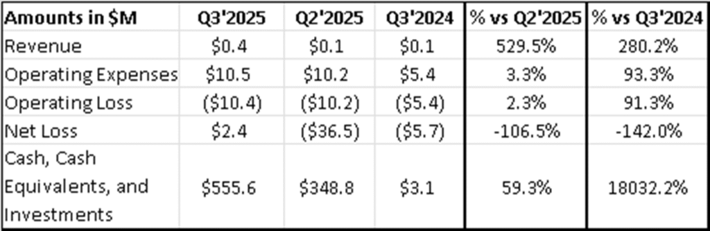 Quantum Computing Inc. (QUBT), an integrated photonics and quantum optics technology company, delivered a Q3 2025 financial report that shows significant revenue growth and, more dramatically, a transformation of its balance sheet into a war chest for future growth. The table below summarizes key financial metrics for Q3 2025 with comparisons to the previous quarter, Q2 2025, and the year-ago quarter, Q3 2024.