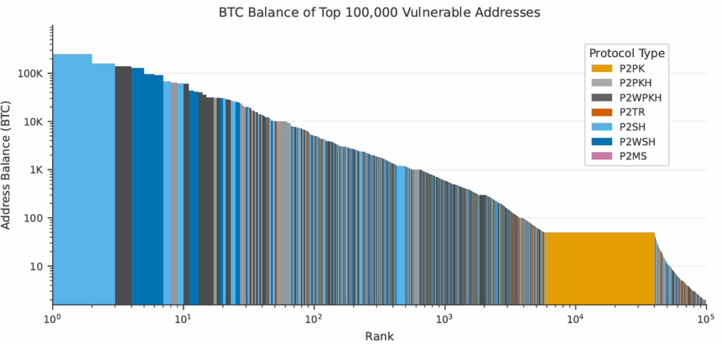 The existence of “historic P2PK” (Pay-to-Public-Key) assets—wallets that have not moved funds in years and primarily date back to the network’s first year—presents a unique policy challenge. Approximately 1.7 million BTC are currently held in these Satoshi-era scripts, which have been largely phased out in favor of more secure hashed formats like P2PKH. Because the public keys for these UTXOs are exposed directly on the ledger, they are vulnerable to “at-rest” attacks by a CRQC. As illustrated in the Google whitepaper’s Figure 7, which ranks vulnerable addresses by balance, these fixed targets cannot be migrated to Post-Quantum Cryptography (PQC) because the owners have likely lost their private keys, leaving hundreds of billions of dollars in digital wealth effectively abandoned.